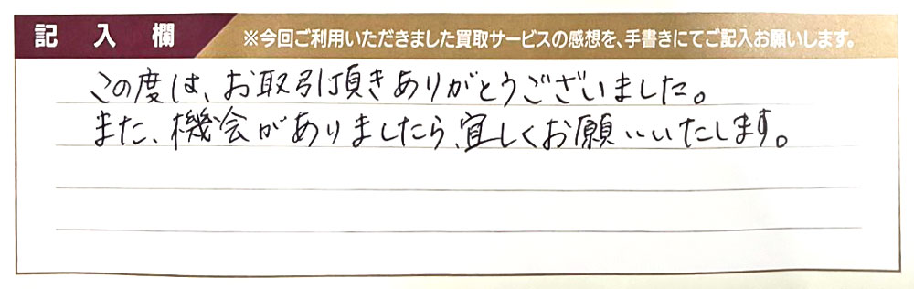 この度は、お取引頂きありがとうございました。 また、機会がありましたら宜しくお願いいたします。