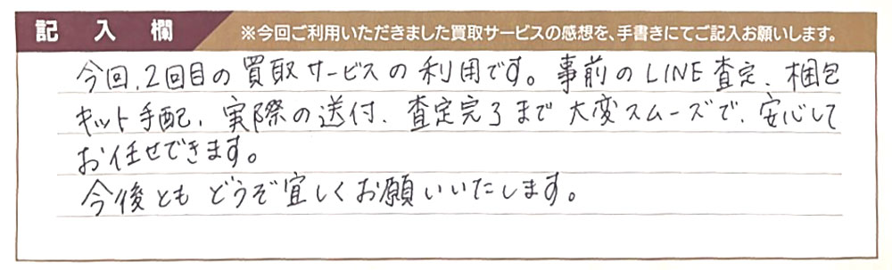 今回、2回目の買取サービスの利用です。 事前のLINE査定、梱包キット手配、実際の送付、査定完了まで大変スムーズで安心してお任せできます。 今後ともどうぞ宜しくお願いいたします。