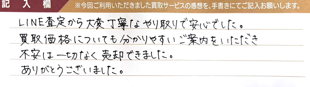 LINE査定から大変丁寧なやり取りで安心でした。 買取価格についても分かりやすいご案内をいただき不安は一切なく売却できました。 ありがとうございました。