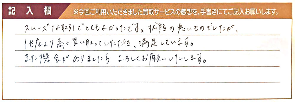 スムーズな取引でとてもよかったです。 状態の悪いものでしたが、他店より高く買い取っていただき、満足しています。 また機会がありましたらよろしくお願いいたします。