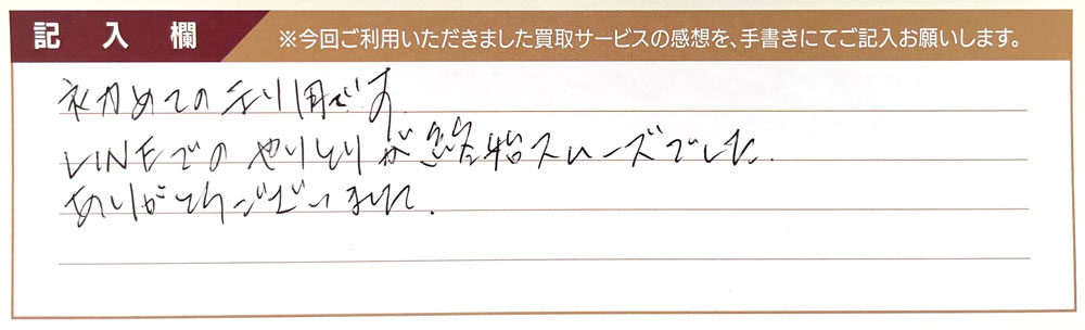 初めての利用です。 LINEでのやりとりが終始スムーズでした。 ありがとうございました。