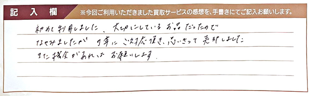 初めて利用しました。 大切にしているお品だったのでなやみましたが丁寧にご対応頂き、思いきって売却しました。 また機会があればお願いします。