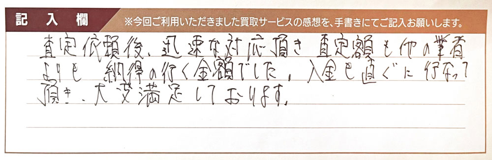 査定依頼後、迅速な対応頂き査定額も他の業者よりも納得の行く金額でした。 入金も直ぐに行って頂き、大変満足しております。