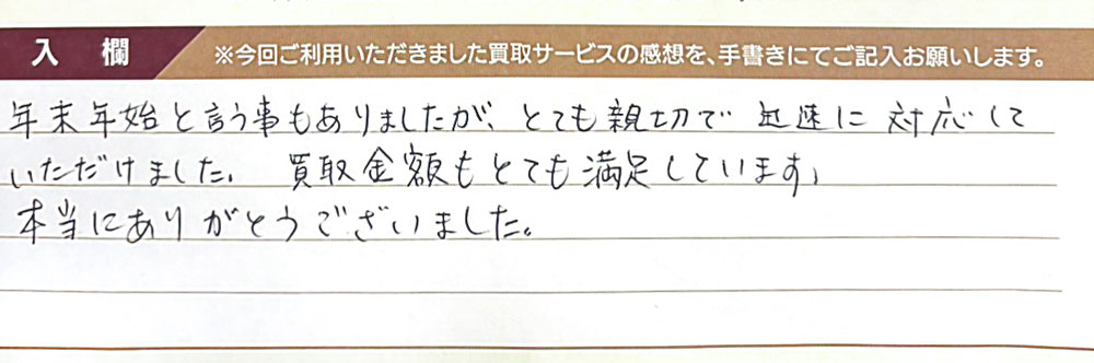 年末年始と言う事もありましたが、とても親切で迅速に対応していただけました。 買取金額もとても満足しています。 本当にありがとうございました。