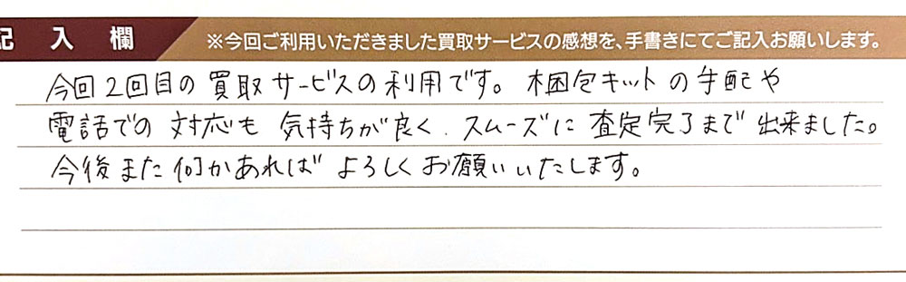 梱包キットの手配や電話での対応も気持ちが良く、スムーズに査定完了まで出来ました。
