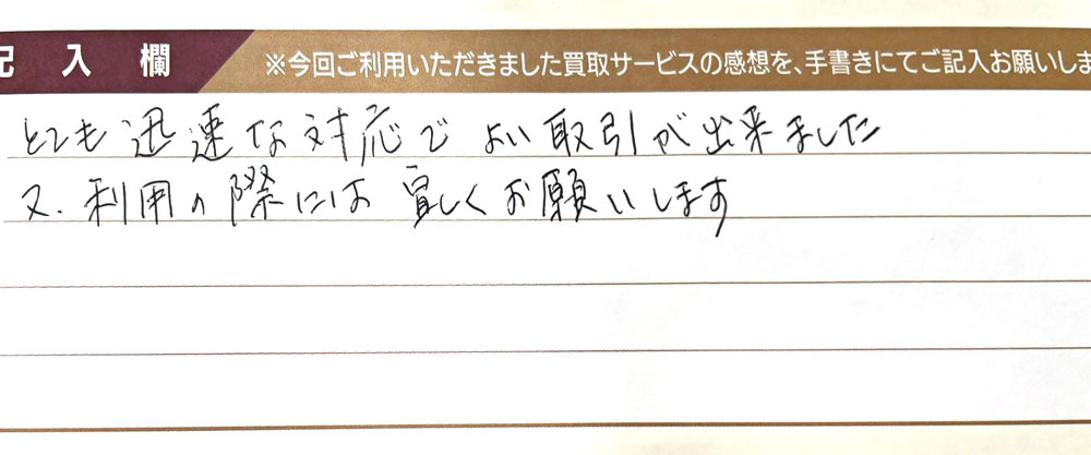 とても迅速な対応でよい取引が出来ました。 又、利用の際には宜しくお願いします。