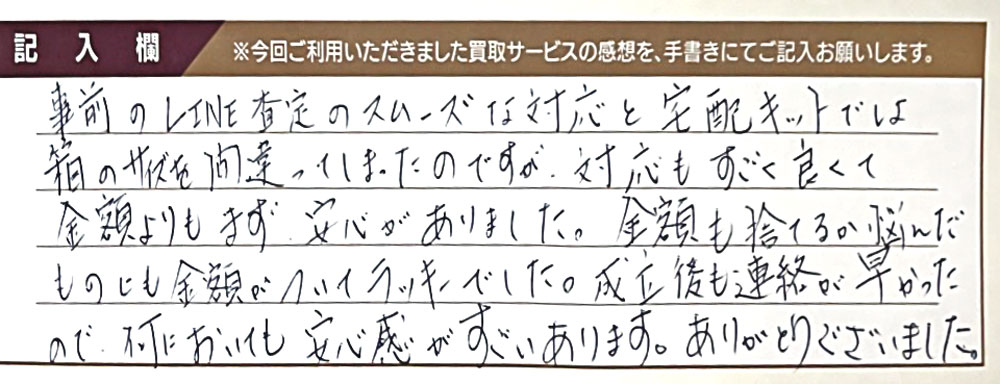 事前のLINE査定のスムーズな対応と宅配キットでは箱のサイズを間違ってしまったのですが、対応もすごく良くて金額よりもまず安心がありました。