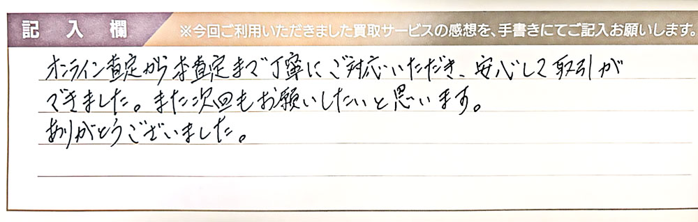 オンライン査定から本査定まで丁寧にご対応いただき、安心して取引ができました。 また次回もお願いしたいと思います。 ありがとうございました。