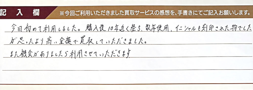 購入後10年近く経ち数年使用、イニシャルも刻印された物でしたが思ったより高い金額で買取していただきました。