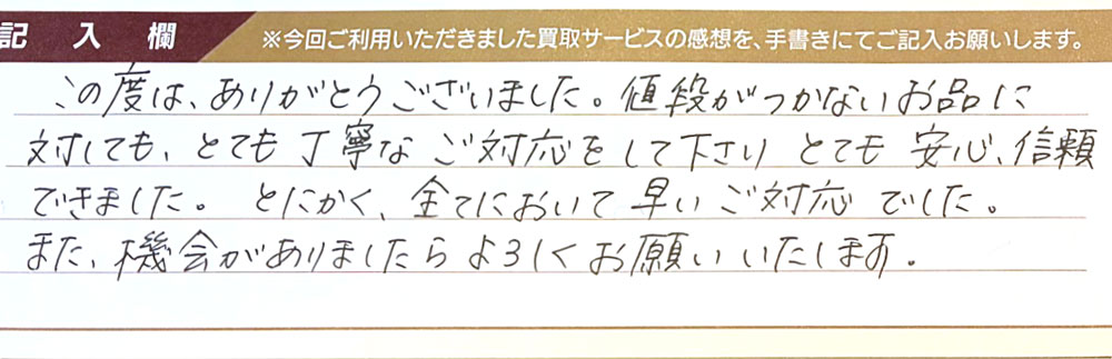 値段がつかないお品に対しても、とても丁寧なご対応をして下さりとても安心、信頼できました。