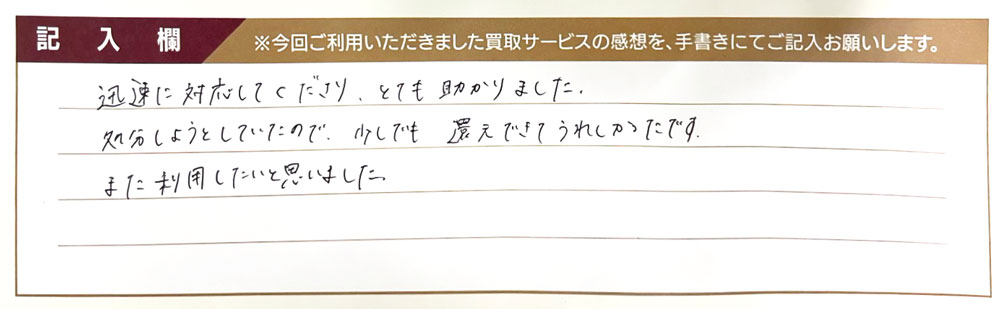 迅速に対応してくださり、とても助かりました。 処分しようとしていたので少しでも還元できてうれしかったです。 また利用したいと思いました。