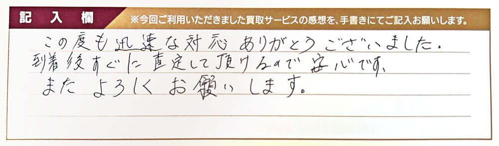 この度も迅速な対応ありがとうございました。 到着後すぐに査定して頂けるので安心です。 またよろしくお願いいたします。