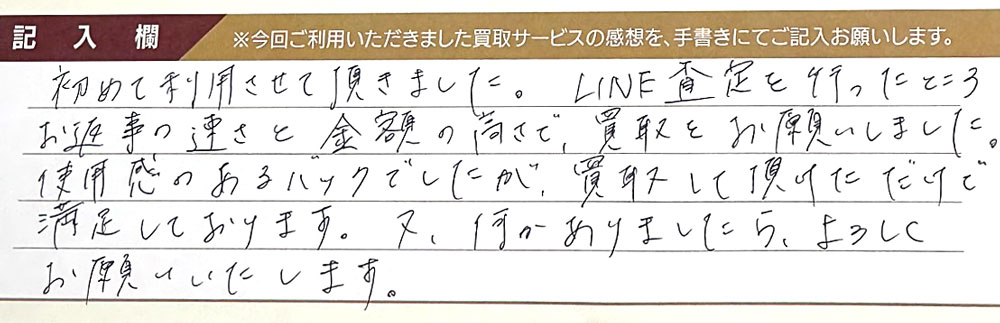 LINE査定を行ったところお返事の速さと金額の高さで、買取をお願いしました。