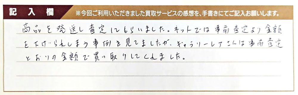 ネットでは事前査定より金額を下げられてしまう事例を見てましたが、ギャラリーレアさんは事前査定とおりの金額で買い取りしてくれました。