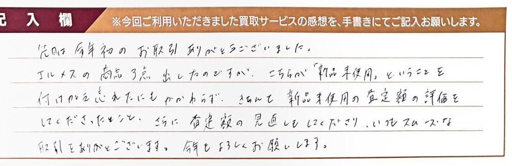 エルメスの商品3点出したのですが、こちらが「新品未使用」ということを付け加え忘れたにもかかわらず、きちんと新品未使用の査定額の評価をしてくださったこと、さらに査定額の見直しもしてくださり、いつもスムーズな取引をありがとうございます。