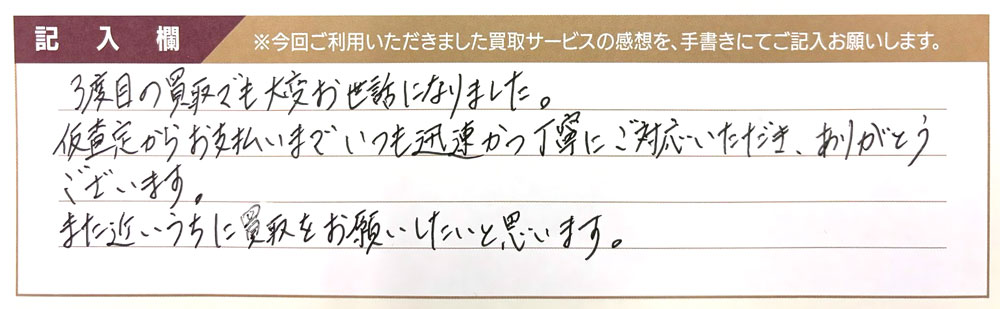 仮査定からお支払いまでいつも迅速かつ丁寧にご対応いただき、ありがとうございます。
