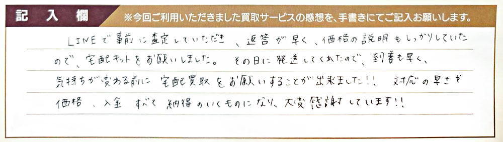 その日に発送してくれたので、到着も早く、気持ちが変わる前に宅配買取をお願いすることが出来ました!!