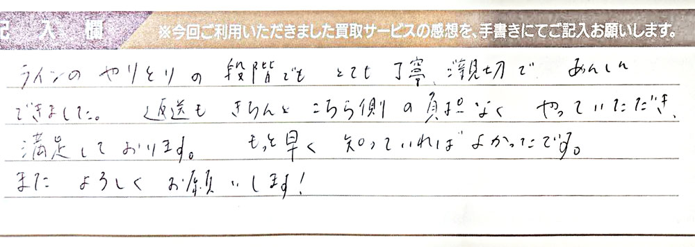 ラインのやりとりの段階でもとても丁寧、ご親切であんしんできました。