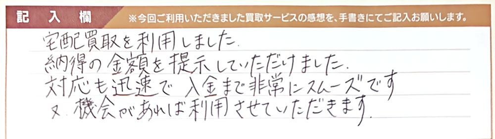 宅配買取を利用しました。 納得の金額を提示していただけました。 対応も迅速で入金まで非常にスムーズです。 又、機会があれば利用させていただきます。