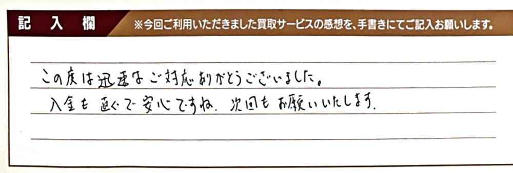 この度は迅速なご対応ありがとうございました。 入金も直ぐで安心ですね。 次回もお願いいたします。