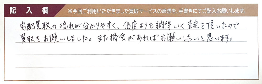 宅配買取の流れが分かりやすく、他店よりも納得のいく査定を頂いたので買取をお願いしました。 また機会があればお願いしたいと思います。