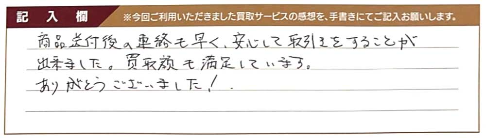 商品送付後の連絡も早く、安心して取引きすることが出来ました。 買取額も満足しています。 ありがとうございました!