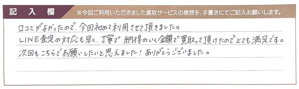 LINE査定の対応も早く、丁寧で納得のいく金額で買取って頂けたのでとても満足です。