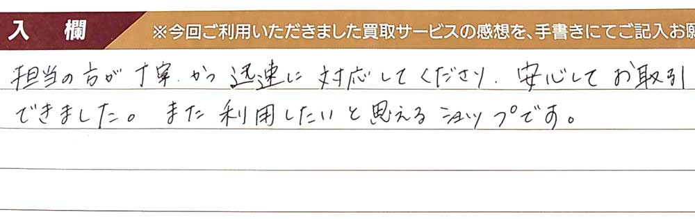 担当の方が丁寧かつ迅速に対応してくださり、安心してお取引できました。 また利用したいと思えるショップです。
