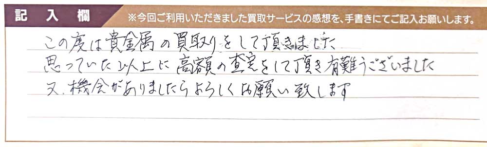 この度は貴金属の買取りをして頂きました。 思っていた以上に高額の査定をして頂き有難うございました。 又、機会がありましたらよろしくお願い致します。