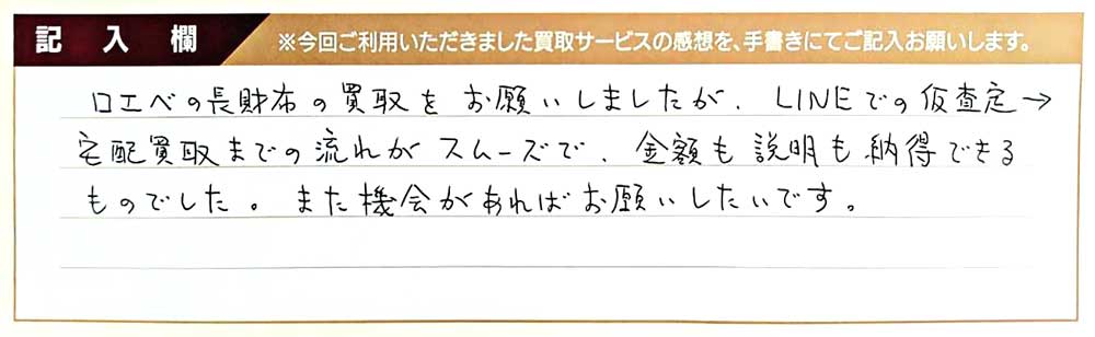 ロエベの長財布の買取をお願いしましたが、LINEでの仮査定→宅配買取までの流れがスムーズで、金額も説明も納得できるものでした。