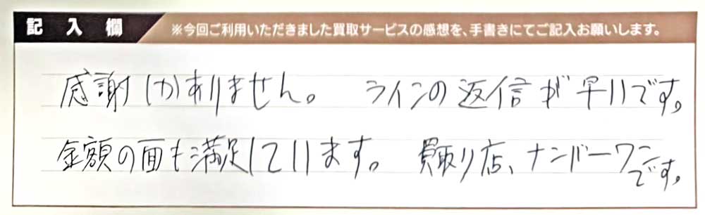 感謝しかありません。 ラインの返信が早いです。 金額の面も満足しています。 買取り店、ナンバーワンです。