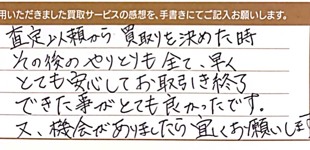 査定依頼から買取りを決めたときその後のやりとりも全て早く、とても安心してお取引き終了できた事がとても良かったです。