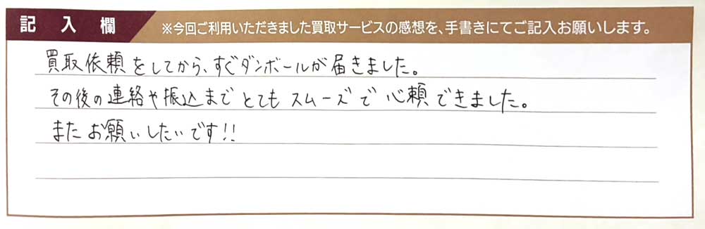 買取依頼をしてから、すぐダンボールが届きました。 その後の連絡や振込までとてもスムーズで信頼できました。 またお願いしたいです!!