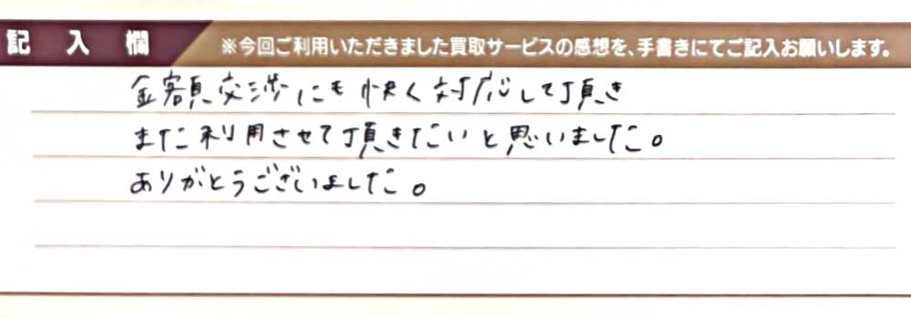 金額交渉にも快く対応して頂き、また利用させて頂きたいと思いました。 ありがとうございました。