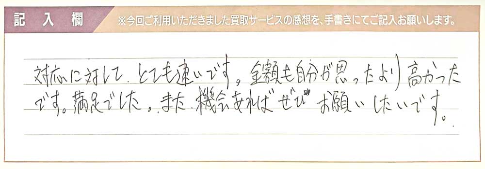 対応に対して、とても速いです。 金額も自分が思ったより高かったです。 満足でした。 また機会があればぜひお願いしたいです。