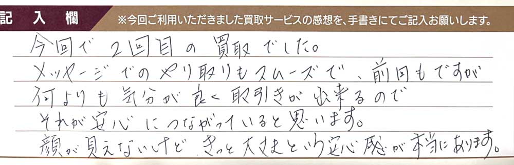 メッセージでのやり取りもスムーズで、前回もですが何よりも気分が良く取引きが出来るのでそれが安心につながっていると思います。